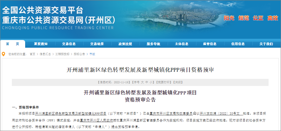 日前,全国公共资源交易平台发布开州浦里新区绿色转型发展及新型城镇化PPP项目资格预审公告,该项目已由重庆市开州区发展和改革委员会以开州发改浦〔2022〕35号文批准,项目总投资为105.19亿元,其中工程费用70.3亿元。