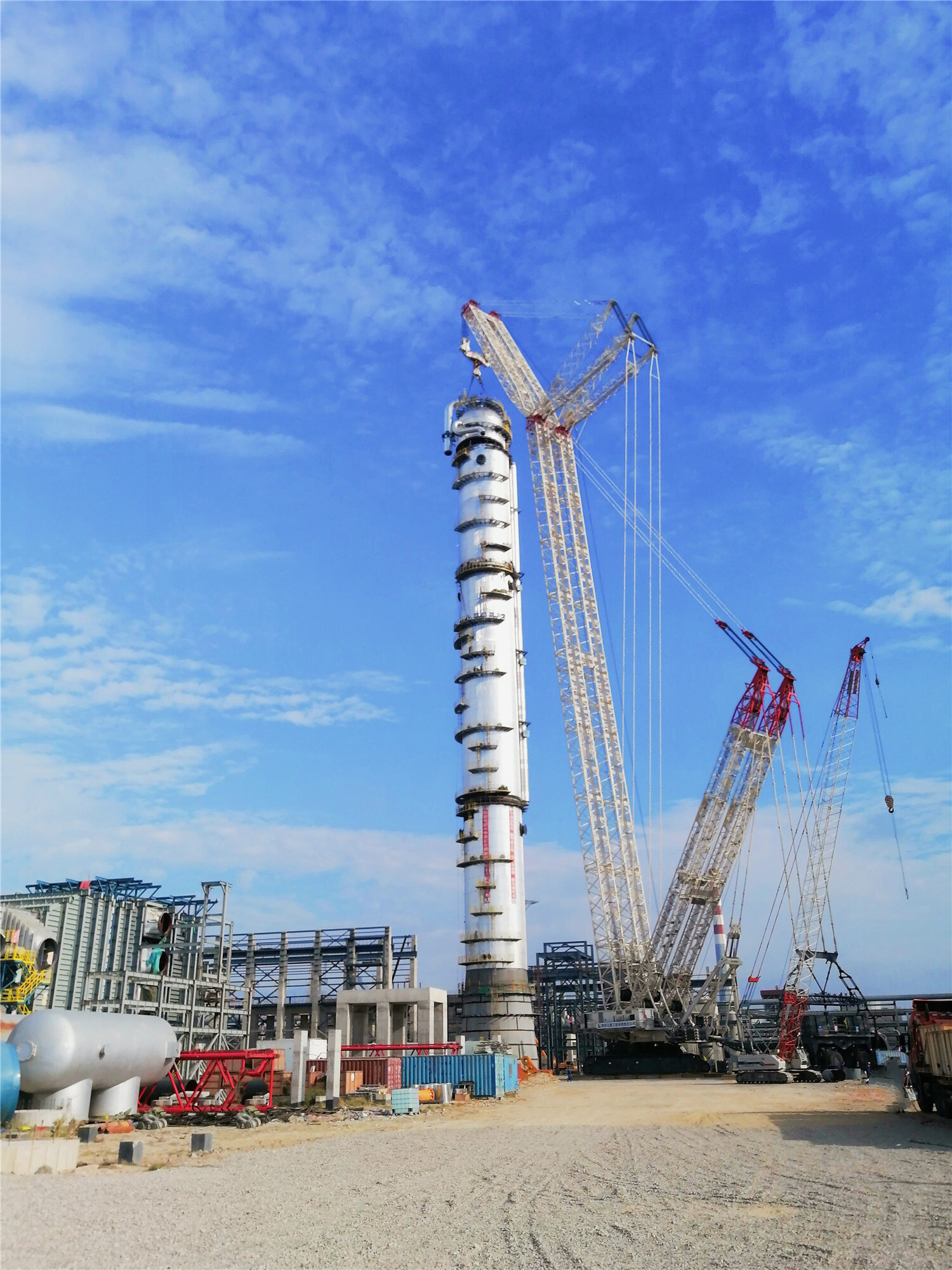 The propane propylene separation tower hoisted this time is the core equipment of Zhongjing Petrochemical's 1 million ton/year propane dehydrogenation project, and it is also the highest and largest propane propylene separation tower in the world, with a height of 138 meters, a weight of 2700 tons, and a volume of 11000 cubic meters. Combined with the actual situation on site, SPCECC is installed by means of on-site assembly and sectional hoisting.