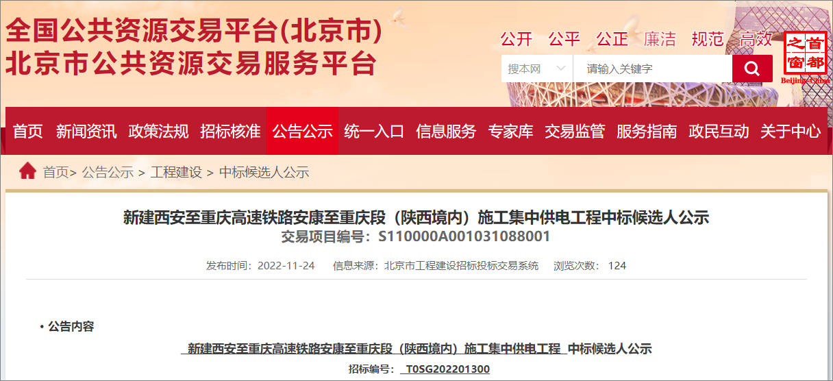 2022年11月24日,全国公共资源交易平台发布了新建西安至重庆高速铁路安康至重庆段陕西境内施工集中供电工程中标候选人公示,该项目分为4各标段,由中铁十九局、中铁一局等7家单位中标,投标报价约111亿元。