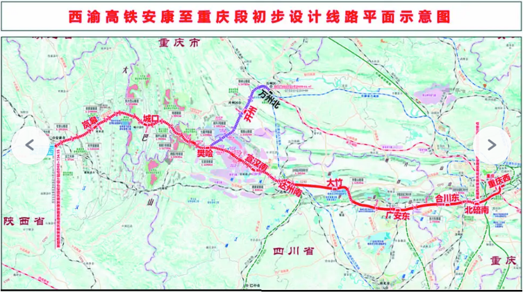 建设规模:新建西安至重庆高速铁路安康至重庆段陕西境内线路起于西康高铁安康西站,向南跨汉江后溯岚河而上至岚皋县,设站后溯滔河而上,穿大巴山,隧道长14172m,到达陕渝省界。里程范围:DK0+734.55~DK81+000,新建线路总长80.27km,桥梁13座长5.26km,隧道14座长74.12km,桥隧总长79.38km,桥隧比98.9%,车站1座为岚皋站。设计时速350公里/小时,工期6年。