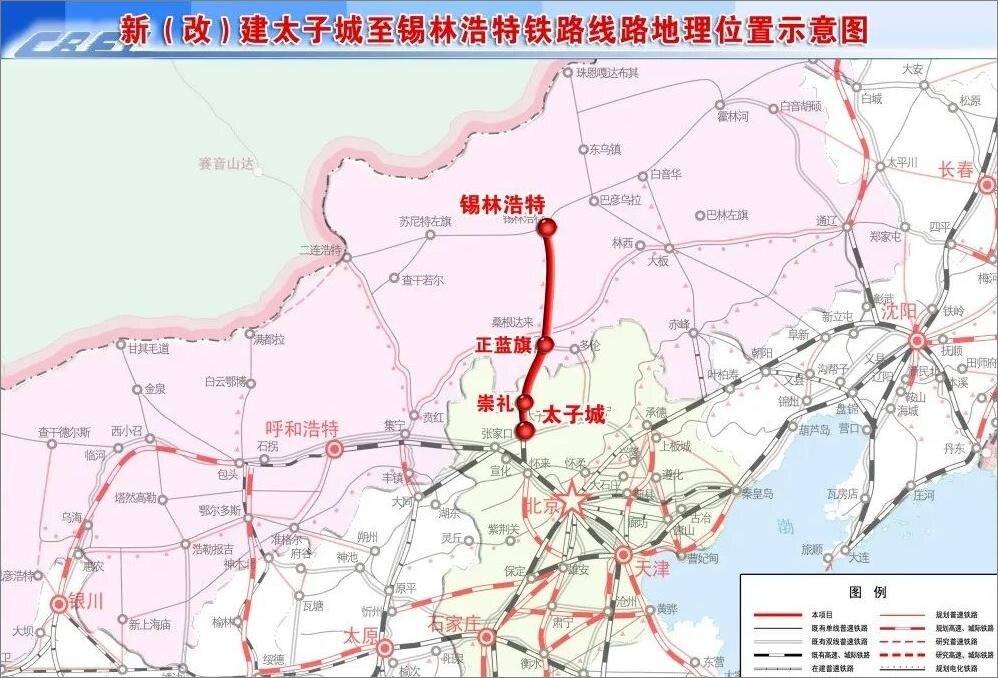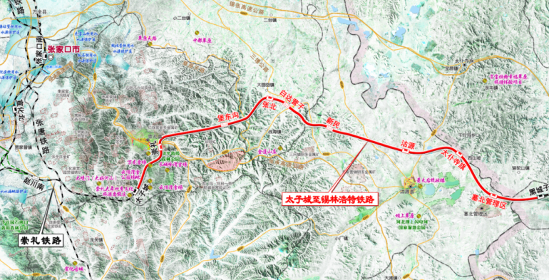 太子城至锡林浩特铁路河北段工程,线路自既有崇礼站引出,向西北经石窑子穿越摩天岭,经张北县大囫囵镇设张北站、沽源县西侧设沽源站,折向西北,进入太仆寺旗境内,在千金沟镇西山坡村设太仆寺旗站,再向东北走行至张家口市塞北管理区设塞北管理区站,继续北行至既有蓝黑线黑城子站。