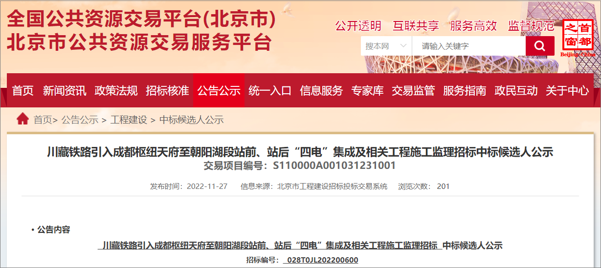 2022年11月27日,北京市公共资源交易服务平台发布川藏铁路引入成都枢纽天府至朝阳湖段站前、站后“四电”集成及相关工程中标候选人公示,项目共分为4个标段,投标总报价约70亿元。