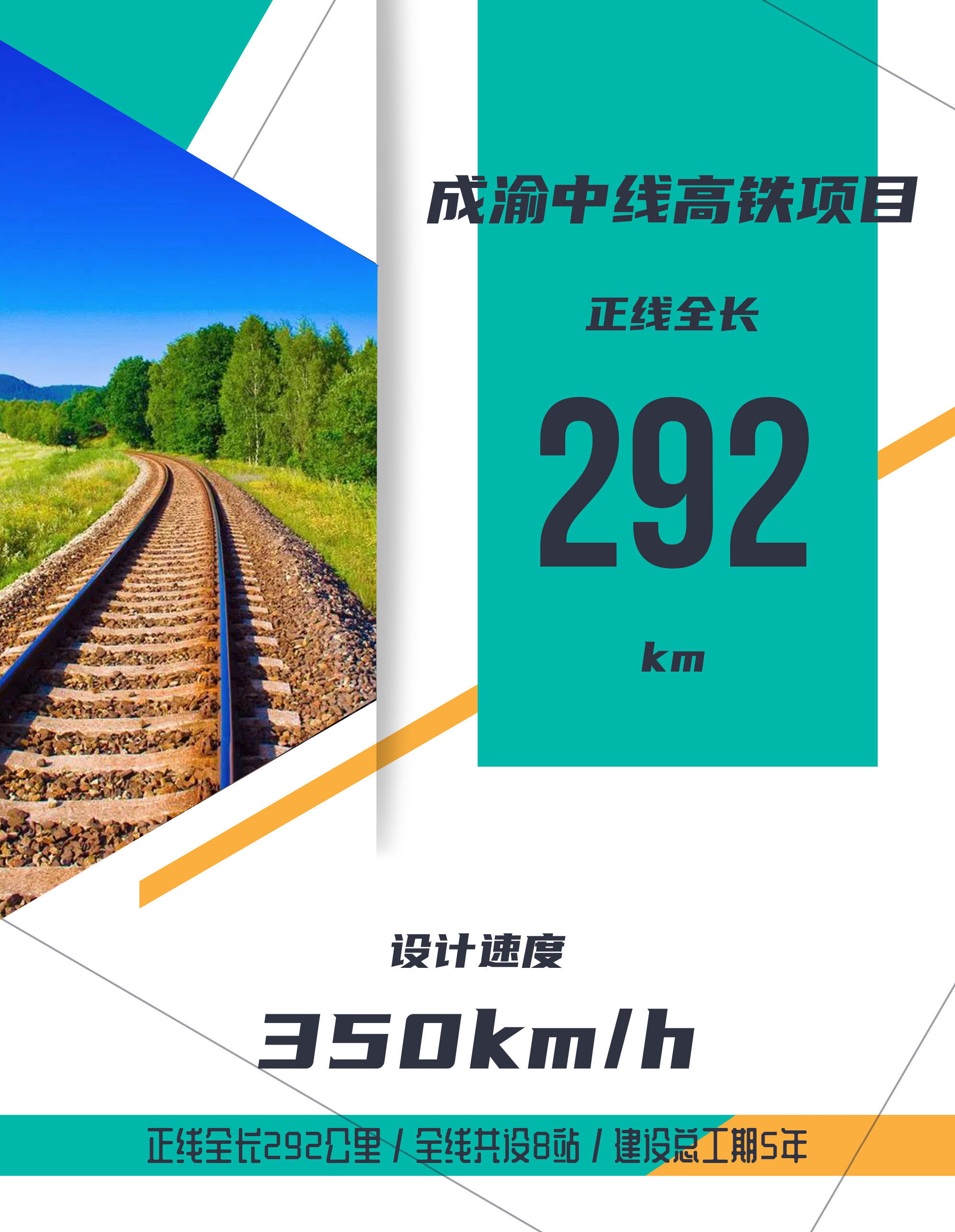 成渝中线高铁自重庆枢纽重庆北站起,向西经重庆市渝北区、沙坪坝区、璧山区、铜梁区、大足区,四川省资阳市、成都市,引入成都枢纽成都站,正线全长292公里,设计时速350公里,部分区段预留进一步提速条件,建设工期5年。