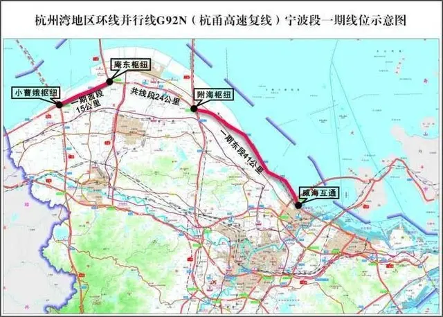 杭州湾地区环线并行线G92N杭甬高速复线宁波段一期工程位于余姚市、杭州湾新区、慈溪市和镇海区,新建路线由西段、东段组成,全长约55.475Km,其中:西段K0+000-K15+315段即小曹娥枢纽至庵东互通段,路线长约15.315Km,分别联接杭州湾大桥和杭甬高速复线绍兴方向,在建杭州湾跨海大桥杭甬高速连接线;东段K0+364-K40+520段即附海枢纽至威海互通段,路线长约40.156Km,分别联接杭州湾大桥南接线,与金塘大桥相交后止于镇海区威海路。全线布设互通式立交9处,其中新建8处,分别是小曹娥、庵东西、附海、慈东、龙山、澥浦、滨海、威海和利用已建1处为庵东,设收费站6处,管理分中心、养护工区、大桥管理站和治超站各1处。