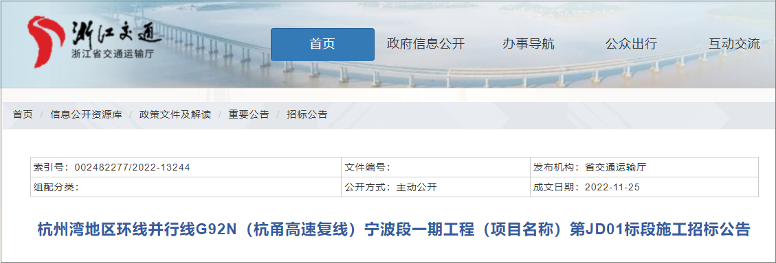 2022年11月25日,浙江省交通运输厅发布杭州湾地区环线并行线G92N杭甬高速复线宁波段一期工程第JD01标段施工招标公告,该项目计划建设工期4年,批复概算179.91亿元。