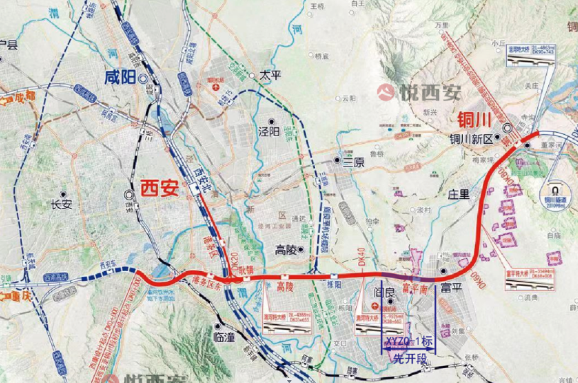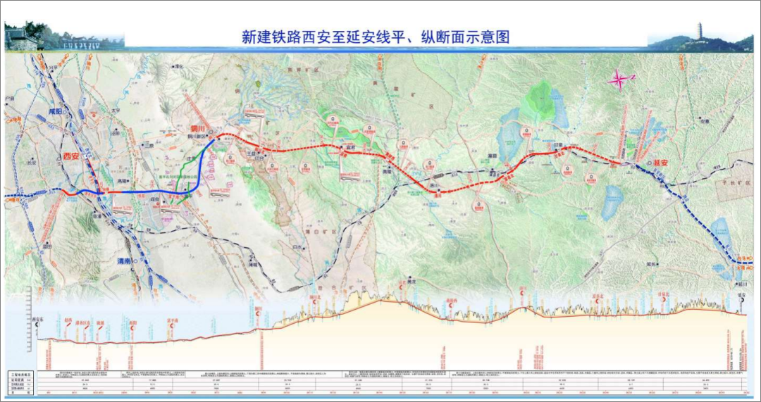新建西安至延安高速铁路自西安北站、西安东站引出,经西安市高陵区、阎良区,渭南市富平县,铜川市耀州区、王益区、印台区、宜君县,延安市黄陵县、洛川县、富县、甘泉县和宝塔区,至既有包西铁路延安站。项目正线全长287.10公里,设计时速350公里/小时。工期4.5年。