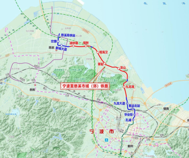 The Ningbo Cixi City Railway starts from Kongpu Station and transfers to Kongpu Station of Ningbo Rail Transit Line 2, then passes through Jiulong Avenue, Jiulong Lake Town, Zhenhai District, passes through Wangjiashan Mountain, arrives at Longshan New City, then continues to the north, passes through Zhangqi and Guanhaiwei, enters Cixi urban area and runs along the North Third Ring Road, then turns north, passes through Kandun Town, and leads to Cixi High Speed Railway Station, the terminal of the line, to transfer with Tongsu Jiayong High Speed Railway Station. The north end of Cixi High speed Railway Station is reserved for extension to Qianwan New Area; In addition, conditions for crossing the city are reserved to the south of Kongpu Station in the long term.