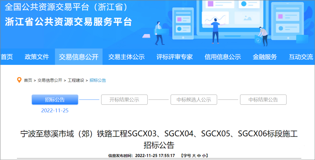 On November 25, 2022, the bidding announcement for construction of bid sections SGCX03, SGCX04, SGCX05 and SGCX06 of Ningbo Cixi City Railway Project will be released. The scope of this bidding is part of the bid section of Ningbo Cixi City Railway Cixi City, of which the civil engineering of Xincheng Avenue Station was officially started in August this year. The total project duration is 4 years.