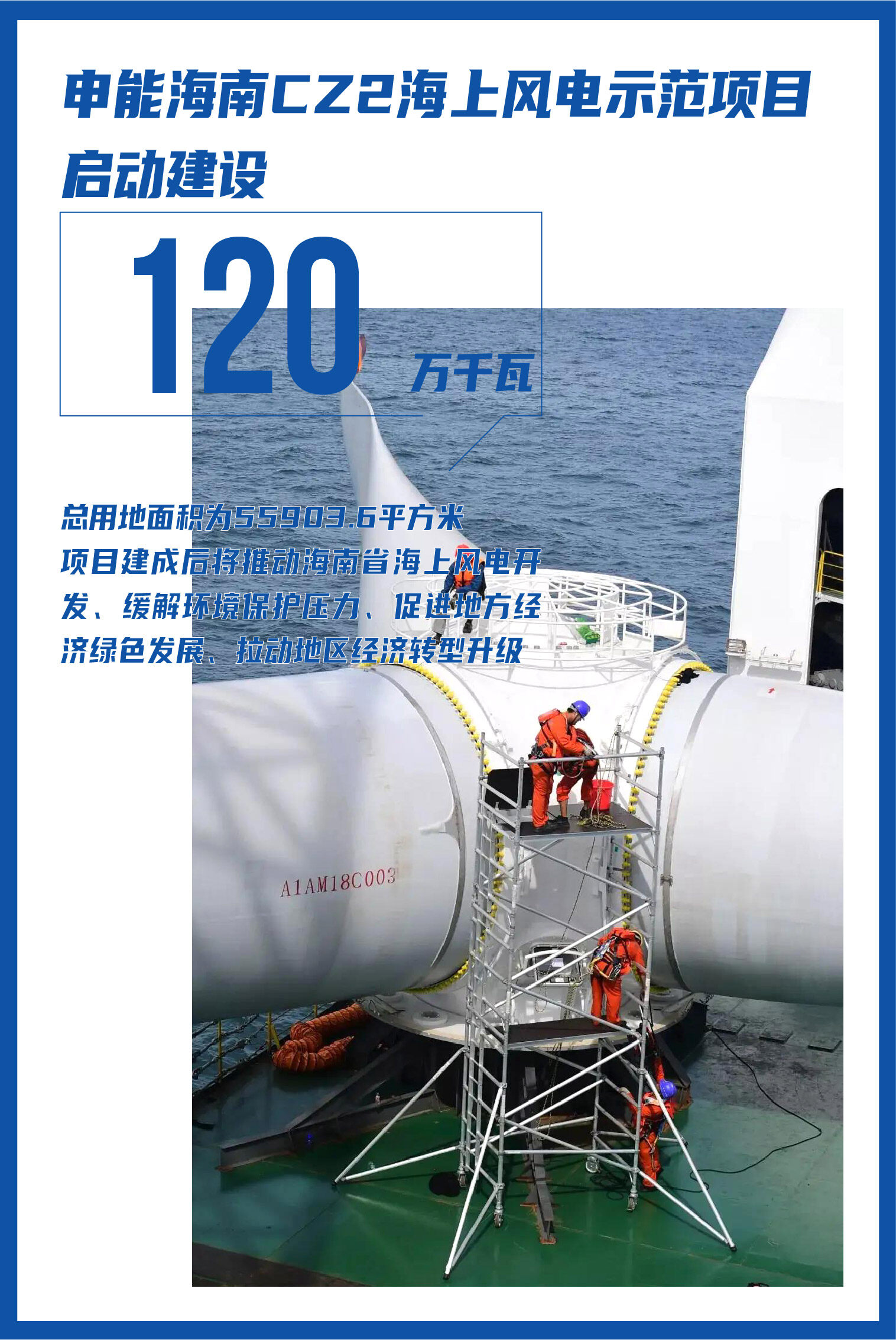 申能海南CZ2海上风电示范项目位于海南儋州市北部湾海域,规划装机容量120万千瓦。项目陆上集控中心位于峨蔓镇旺村南侧,总用地面积为55903.6平方米。项目将新建8到15MW海上风力发电机组工艺生产线,形成年产风电装备150-200套生产力。项目建成后,每年可为电网提供清洁电能38.3亿度,可节约标煤114.6万吨,每年可减少二氧化硫排放量2.42万吨,氮氧化物约1.38万吨,二氧化碳299.1万吨,灰渣约38.7万吨。