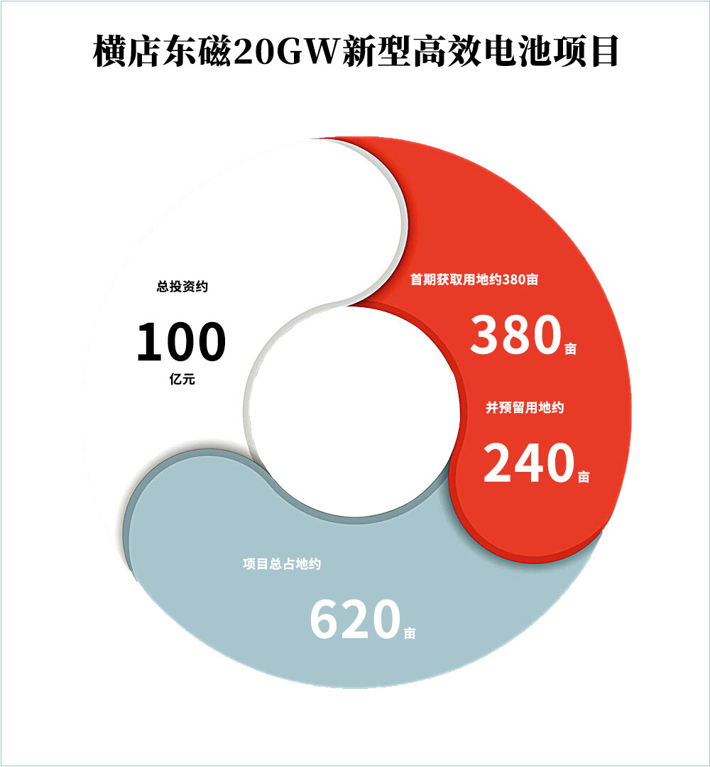 横店东磁20GW新型高效电池项目总投资约100亿元,其中固定资产投资约50亿元。项目分三期实施,其中第一期投资建设年产6GW新型高效TOPCon电池,总投资约30亿。第二期投资建设年产6GW新型高效TOPCon电池,总投资约30亿。第三期投资建设年产8GW下一代高效电池,总投资约40亿元。第三期生产线具体建设规模、建设时间和技术路线将视生产经营情况以及下一代光伏技术成熟情况推进。该项目总占地约620亩,分期开发建设,首期获取用地约380亩,并预留用地约240亩。