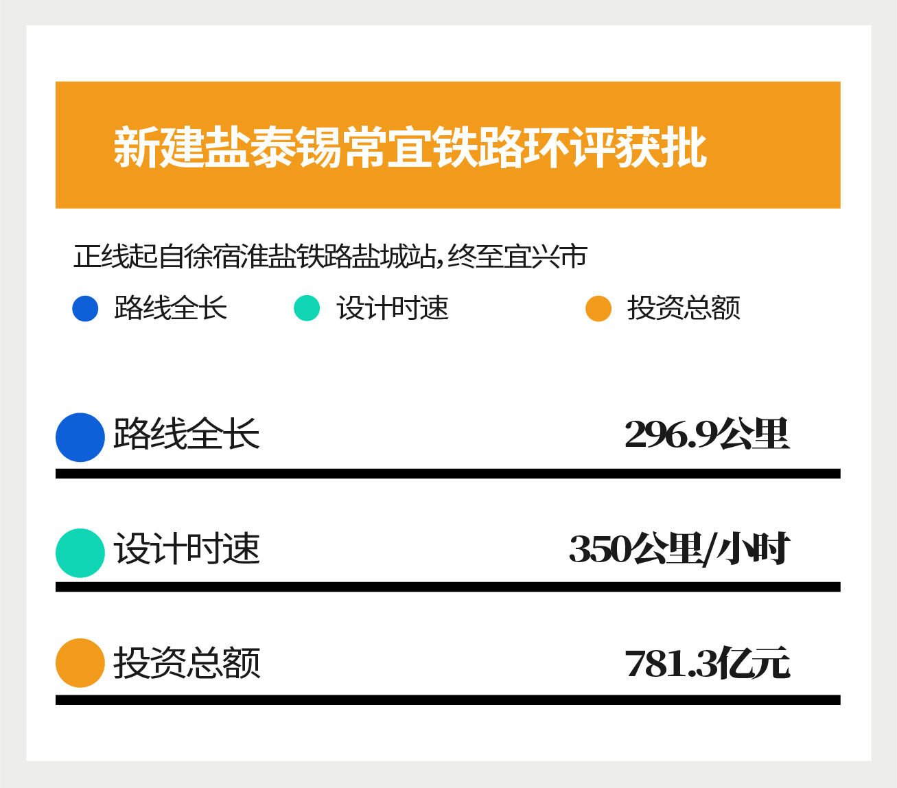 全线共设车站11座,其中新建9座:兴化东站、泰州南站、泰兴东站、靖江东站、江阴站、惠山站、太湖西站、前黄站、宜兴西站(预留);盐城站、宜兴站为既有接轨站。项目总工期4年,工程估算投资总额781.3亿元。