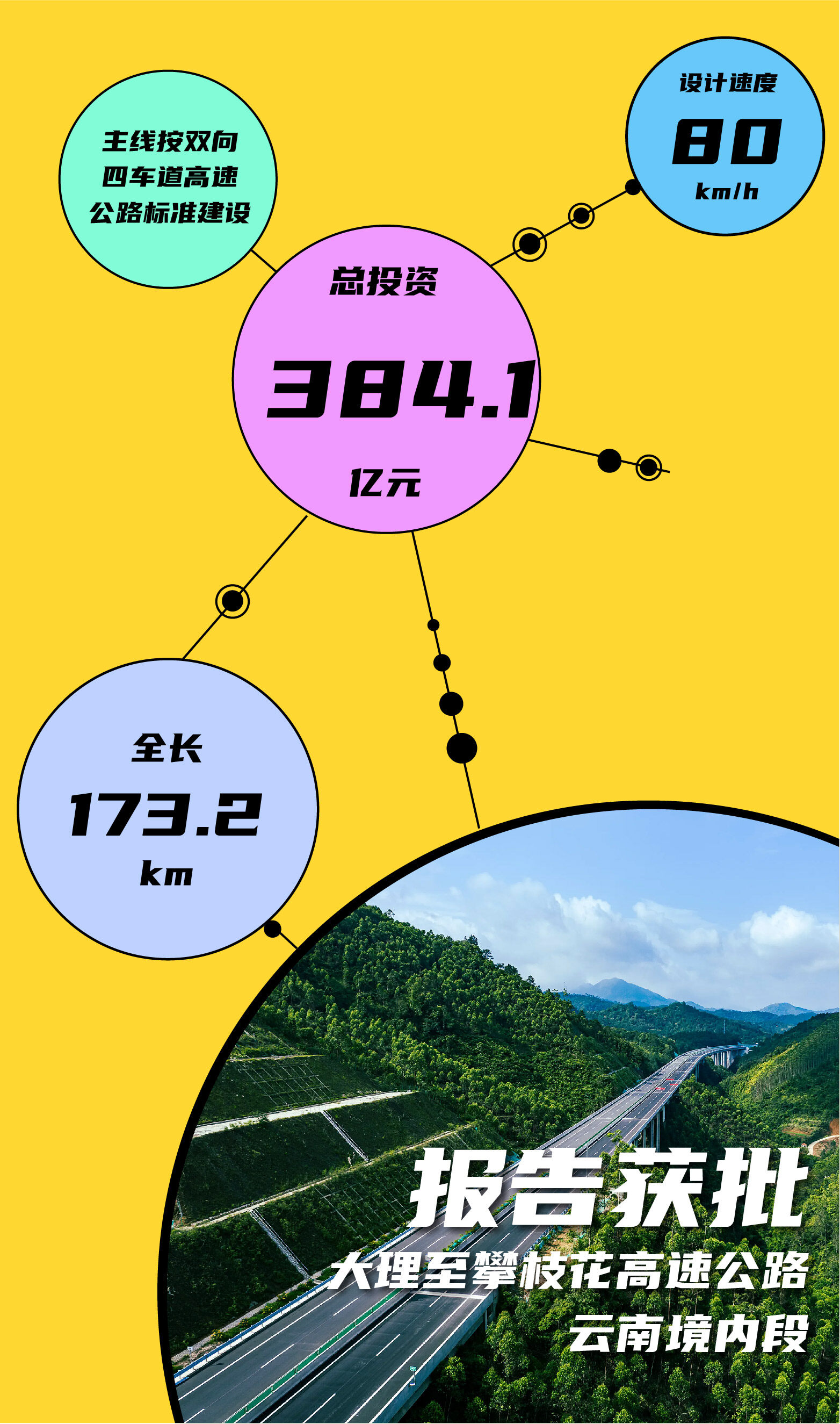 项目主线按双向四车道高速公路标准建设,设计速度80公里/小时。项目主线全长173.18公里,其中楚雄州境内路线约114.301公里,大理州境内路线约58.879公里,批复项目总投资384.11亿元,其中楚雄段256.19亿元,大理段127.92亿元。