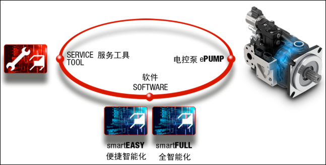 其中关键零部件电控泵集成了MVP柱塞泵、角度传感器、电子压力补偿器和电子控制单元;相比电子控制器与泵体分离的传统解决方案,对于客户来说最明显的优势是简化了机器布局,节约了系统成本。