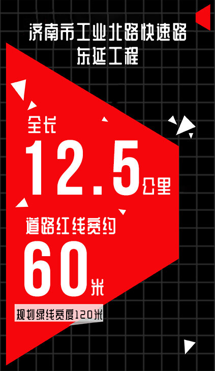 济南市工业北路快速路东延工程位于历城区和高新区。西起郭店立交,东至大正路以东,全长约12.5公里。据该项目此前发布的社会稳定风险分析公众参与公示信息显示,道路红线宽约60米,规划绿线宽度为120米,建设内容包括高架桥梁、地面道路、立交、地面桥梁、人行天桥、雨水、污水、照明、交通设施、景观绿化和管线配套,工期2年。
