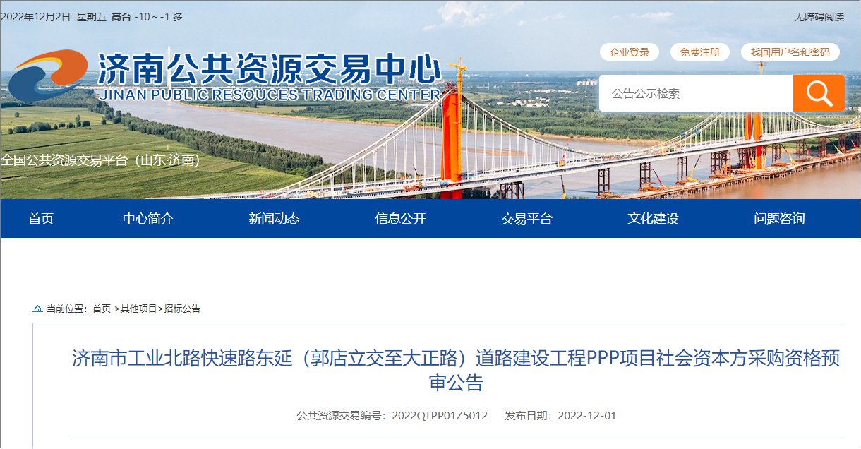 2022年12月1日,济南公共资源交易中心发布济南市工业北路快速路东延郭店立交至大正路道路建设工程PPP项目社会资本方采购资格预审公告,该项目所属行业市政,招标人济南市城乡交通运输局,项目总投资108.48亿元。