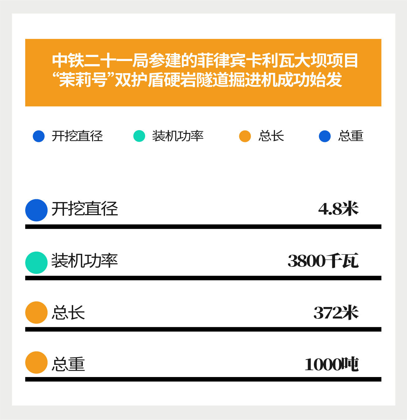 此次始发的“茉莉号”由铁建重工自主研发生产,是我国具有完全自主知识产权、首台出口菲律宾的硬岩隧道掘进机。该盾构机开挖直径4.8米,装机功率3800千瓦,总长372米,总重1000吨,是名副其实的“钢铁穿山甲”。