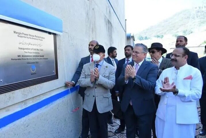 巴基斯坦时间2022年12月5日,由中国电建承建的巴基斯坦曼格拉水电站改造项目新修复5&6号机组落成仪式在自由克什米尔地区曼格拉镇举行。巴基斯坦总理夏巴兹·谢里夫出席仪式并为项目揭牌。巴基斯坦水利水电开发署WAPDA主席萨迦德等政府官员和中国电建项目部代表参加仪式。