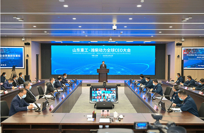 12月10日北京时间晚7:30,山东重工·潍柴动力第四次全球CEO大会在山东济南首次启用的全球总部大楼视频会议中心举行。全球主要公司的管理团队成员“线上+线下”参会。