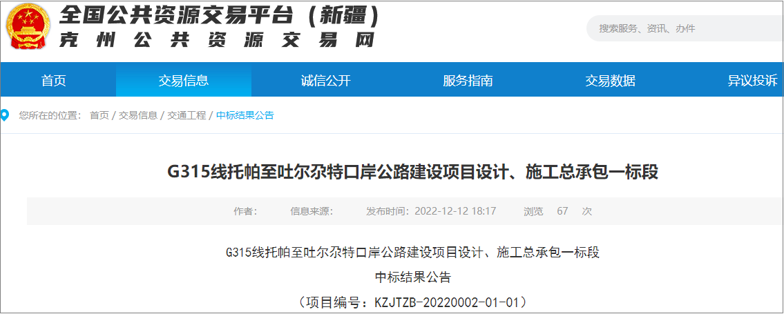 2022年12月12日,全国公共资源交易平台发布了G315线托帕至吐尔尕特口岸公路建设项目设计、施工总承包招标中标公告,该项目共分为3个标段建设,由江西省交通工程集团、苏交科集团等6家单位中标,中标价约52亿元。