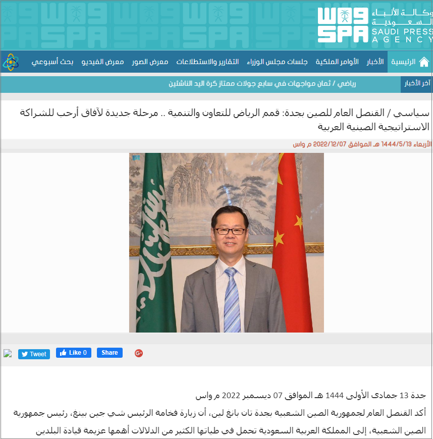 2022年12月7日,在习近平主席赴沙特出席首届中国-阿拉伯国家峰会、中国-海湾阿拉伯国家合作委员会峰会并对沙特进行国事访问之际,驻吉达总领事谭邦林接受沙特通讯社采访。访问全文如下: