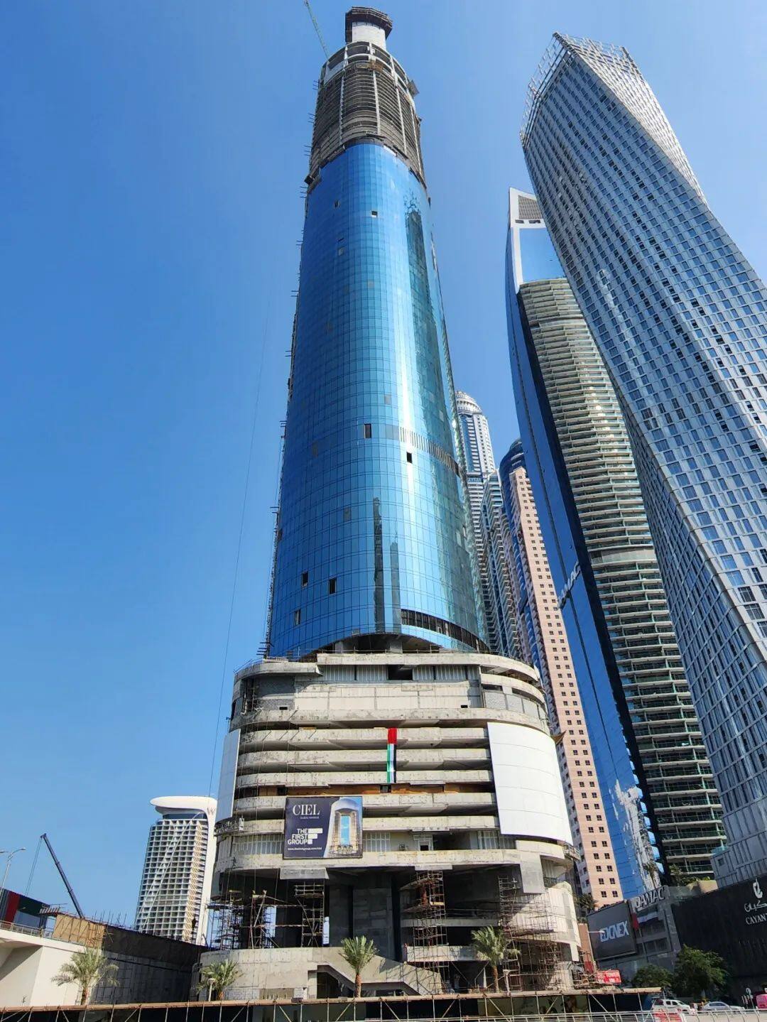 迪拜蓝天酒店项目:中铁十八局集团承建的迪拜蓝天酒店项目位于阿联酋迪拜玛瑞纳地区,占地面积3662平方米,建筑面积约101945平方米,建筑檐高373.5米,是全球最高酒店类建筑,荣获最佳国际酒店建筑设计、阿拉伯国家最优酒店建筑设计、阿拉伯国家最佳高层建筑设计三项设计大奖。