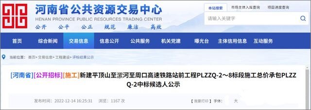 On December 14, 2022, the public announcement of the bid winning candidates for the construction lump sum contracting of the new Pingdingshan Luohe Zhoukou high-speed railway station front project PLZZQ-2~8 bid section was released in Henan Public Resources Trading Center. Pingluo Zhouzhou High speed Railway Project will be officially started at the end of December, with a planned construction period of 3.5 years.