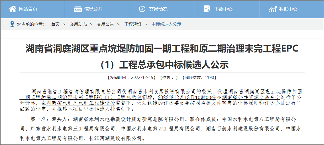 2022年12月15日,湖南省公共资源交易中心发布湖南省洞庭湖区重点垸堤防加固一期工程和原二期治理未完工程EPC(1)工程总承包中标候选人公示,项目由湖南省水利水电勘测设计规划研究总院有限公司牵头的联合体中标,投标报价68.56亿元。