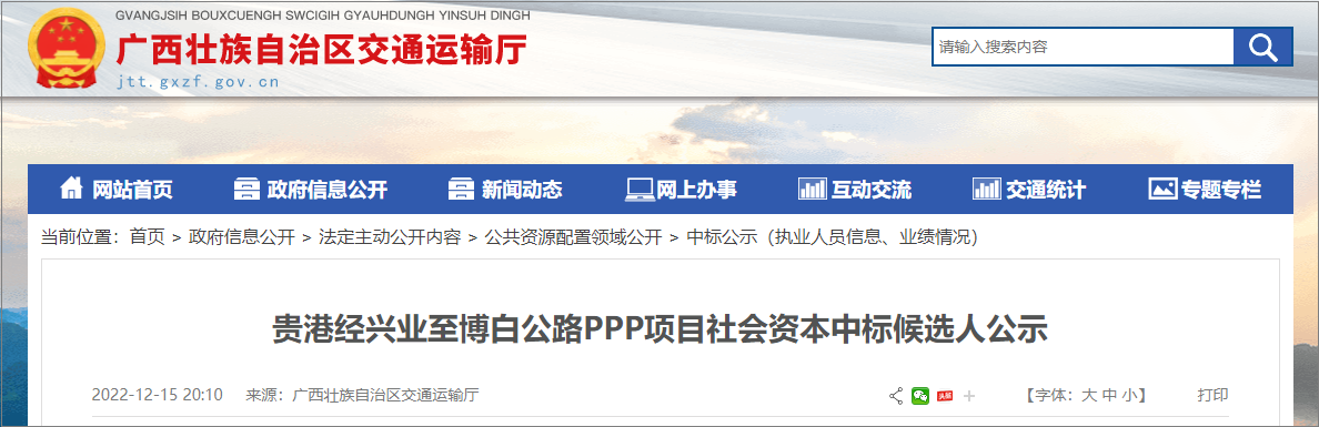 2022年12月15日,广西壮族自治区交通运输厅发布了贵港经兴业至博白公路PPP项目社会资本中标候选人公示,项目由中交二公局联合体中标,项目估算总投资约为143.92亿元,平均每公里造价约1.39亿元。
