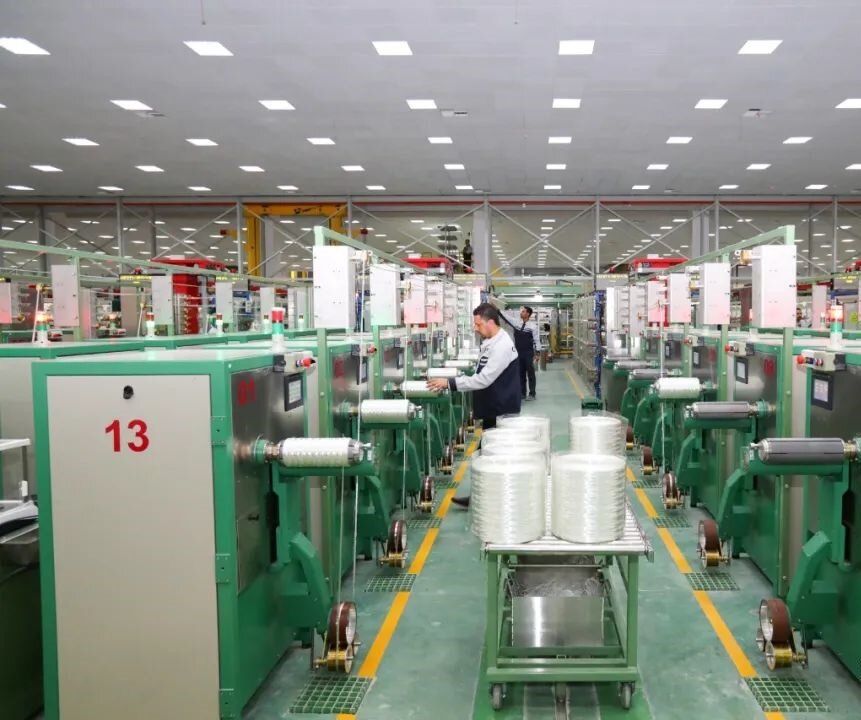 عامل يعمل على خط إنتاج الألياف الزجاجية
