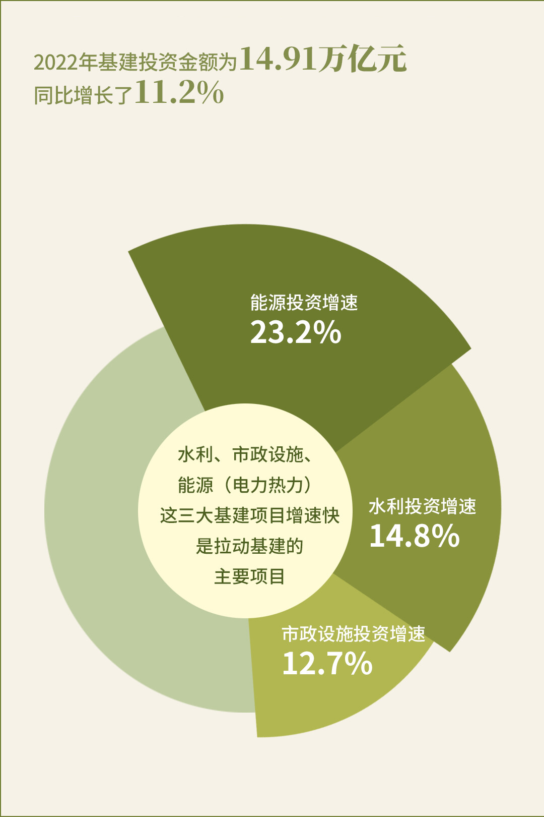 从2022年基建设施的投资来看,前三个季度基建投资是持续发力的,基建投资金额为14.91万亿元,同比增长了11.2%,这其中水利、市政设施、能源(电力热力)这三大基建项目增速快,是拉动基建的主要项目,基建投资增速分别达到14.8%、12.7%、23.2%。