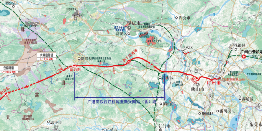 Construction scale: The line starts from Guangzhou Railway Station, runs westward through Foshan, Zhaoqing, Yunfu, Yangjiang, Maoming and Zhanjiang, and ends at Zhanjiang North Railway Station, with a new double line of 400.1 km. Foshan, Shinkansen Airport Station, Xinxing South Station, Yangchun East Station, Yangjiang North Station, Mata Station, Maoming South Station, Wuchuan Station and Zhanjiang North Station are newly established, and Zhanjiang East Station and Yangxi Station are reserved. Guangzhou hub new connecting line and other projects. New Zhanjiang North EMU Station.