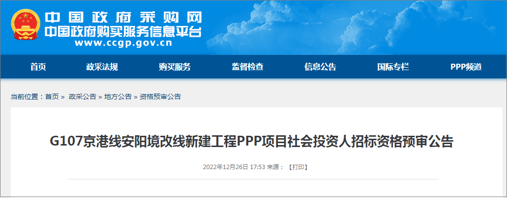 2022年12月26日,安阳市公共资源交易中心发布G107京港线安阳境改线新建工程PPP项目社会投资人招标公告,该项目所属行业公路,招标人安阳市公路事业发展中心,项目总投资59.9亿元。