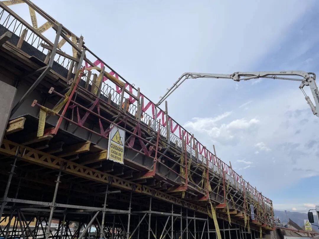 当地时间12月27日,由中国能建葛洲坝国际公司组织实施的秘鲁库斯科公路项目立交桥最后一仓桥面板混凝土顺利浇筑。至此,库斯科公路项目所有桥梁主体结构已全部浇筑完成。