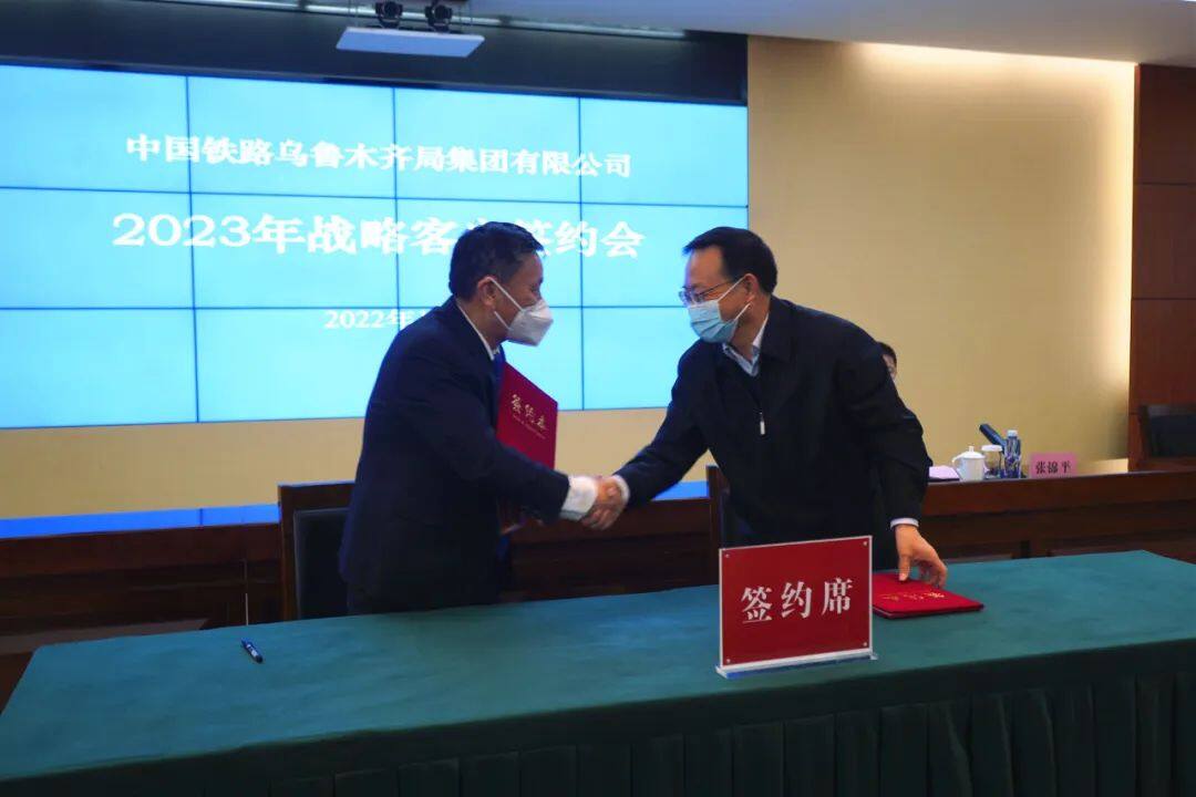 新疆中泰集团、国家能源集团新疆能源有限责任公司、特变电工股份有限公司作为战略客户代表发言。会上,乌铁局集团党委副书记、总经理李育宏与新疆中泰集团党委书记、董事长王洪欣代表双方企业签订《2023年战略合作协议》。