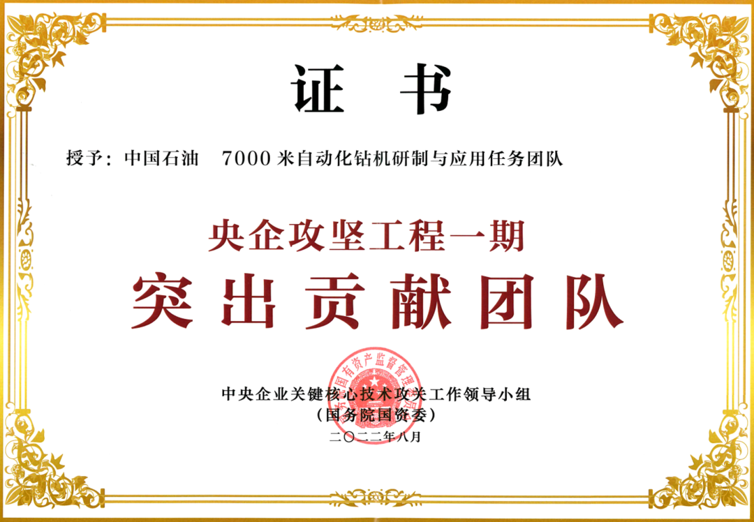 北京传来喜讯——宝石机械7000米自动化钻机研制与应用任务团队被国务院国资委中央企业关键核心技术攻关工作领导小组授予“央企攻坚工程一期突出贡献团队”荣誉称号。