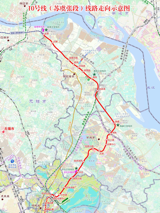 10号线苏虞张段自苏州北站引出,经相城区、常熟市、张家港市,终于金港站,全长90.34公里,设21座车站,平均站间距4.5公里,设计时速160公里/小时。全线设车辆段1处,停车场1处,主变电所4座,新建区域控制中心1座。10号线苏虞张段预计2028年6月建成通车,届时,将与规划10号线在苏州北站实现贯通运营。
