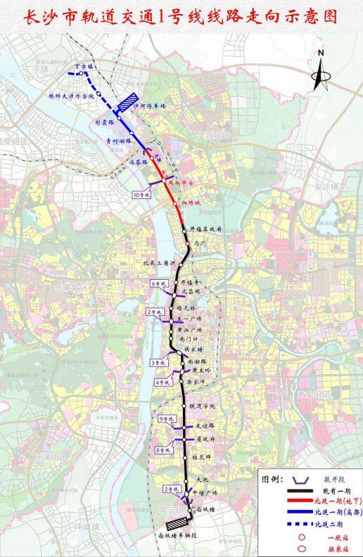 1号线北延线一期延伸线:长沙第三轮地铁建设规划调整方案,拟新增1号线北延二期工程,自彩霞路站(不含)至丁字镇站,线路长度约4.63km,车站2座,采用高架敷设方式。