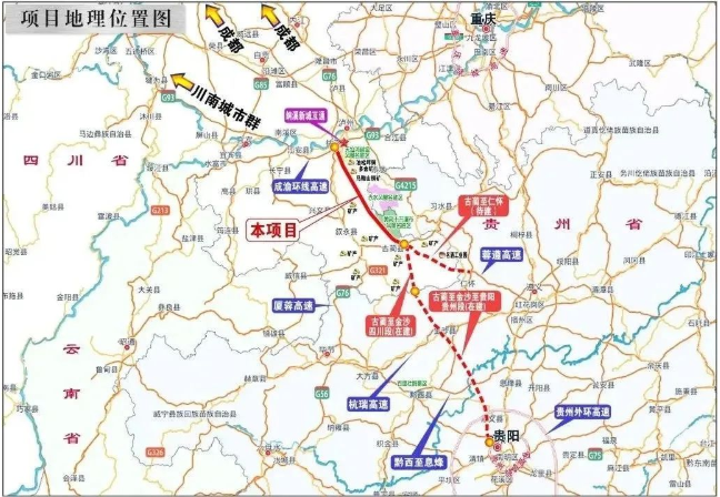 该项目处于成渝经济圈南翼核心城市圈,是国家批复的西部陆海新通道西线西北—成都—贵阳—南宁(广州)出海大通道的重要构成部分,项目建成后将形成成都至贵阳最便捷大通道。