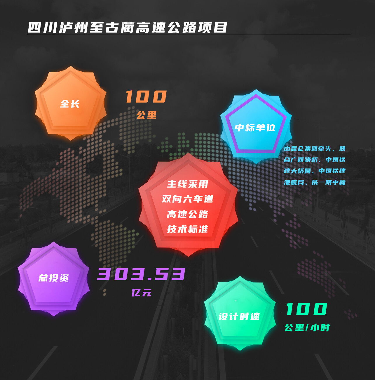 四川泸州至古蔺高速公路BOT项目总投资303.53亿元,由昆仑集团牵头,联合广西路桥、中国铁建大桥局、中国铁建港航局、铁一院中标。泸州至古蔺高速公路全长约100公里,主线采用双向六车道高速公路技术标准,设计时速每小时100公里。