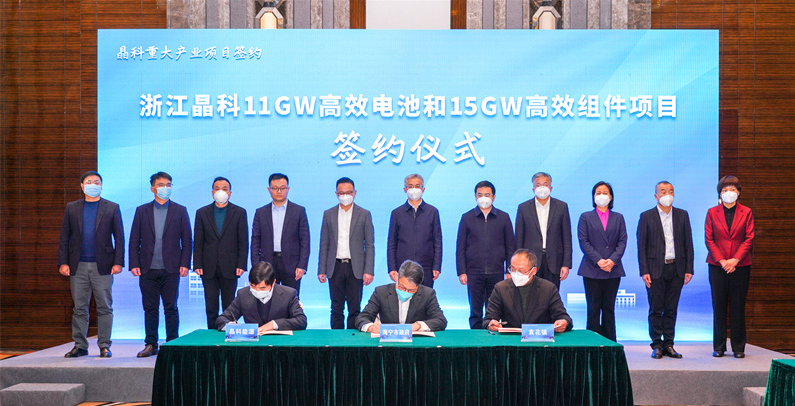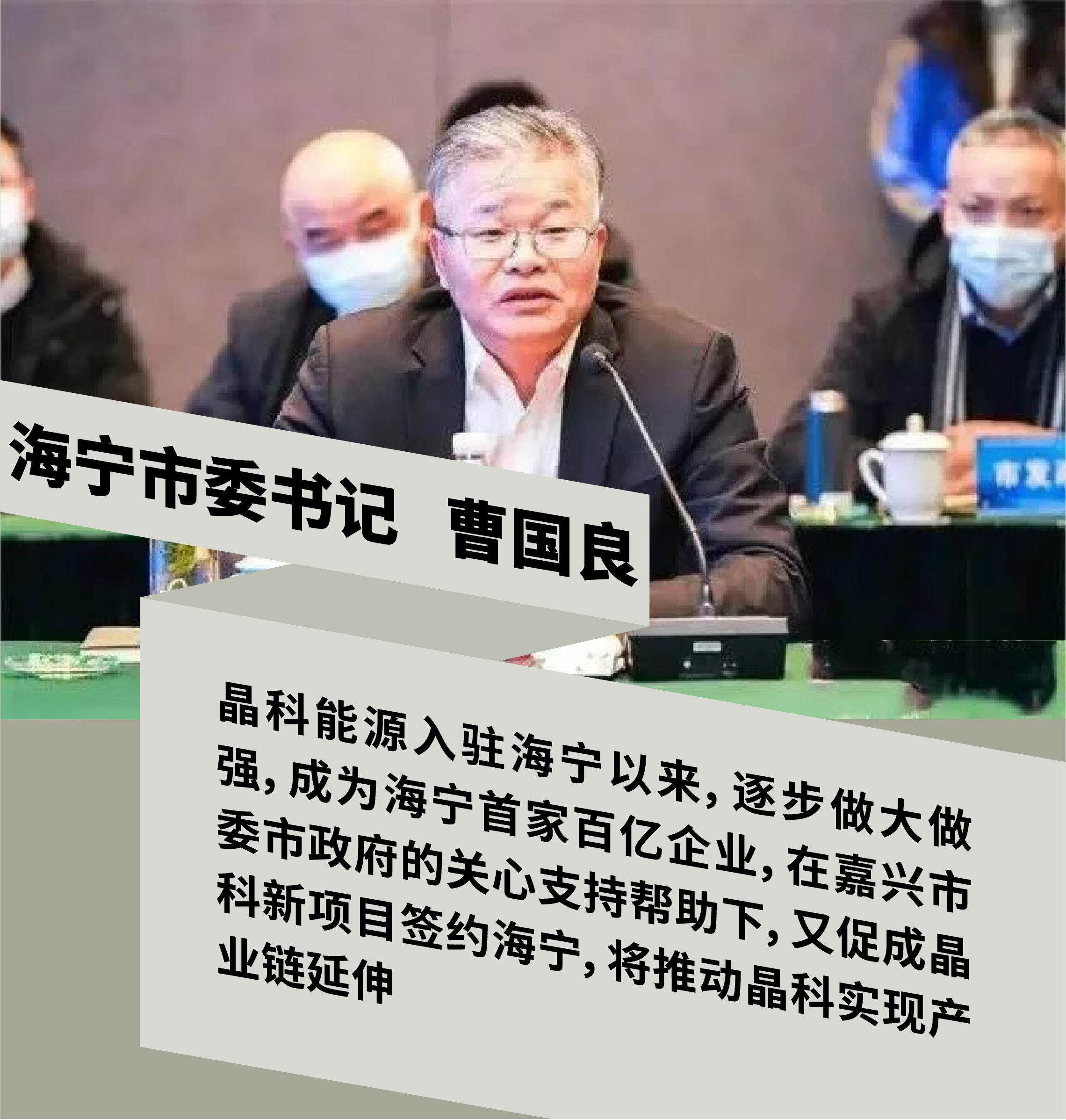 2023年1月3日下午,晶科重大产业项目签约仪式在海宁举行,晶科储能集成系统及产业配套项目和11GW高效电池和15GW高效组件项目两个重大产业项目签约落户海宁,总投资约186.8亿元。嘉兴市委副书记、市长李军,嘉兴市副市长倪沪平,嘉兴市政府秘书长朱少平,海宁市领导曹国良、许红莲、姚敏忠、周红霞等参加活动。