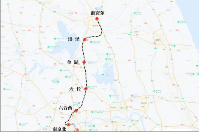 全线设淮安东、洪泽、金湖、天长、六合西、南京北共6座车站,其中洪泽、金湖、天长、六合西、南京北5座车站为新建车站。项目总投资约334亿元,工期预计为4年。