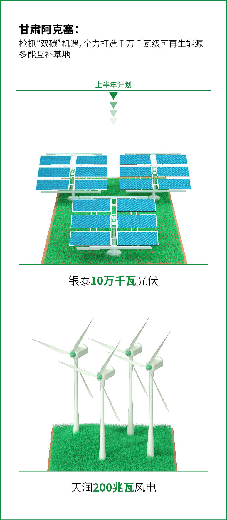 20223年1月5日,阿克塞哈萨克族自治县人民政府发布在第十九届人民代表大会第三次会议上作出的2022年政府工作报告。报告指出,抢抓“双碳”机遇,全力打造千万千瓦级可再生能源多能互补基地,组建成立两家国有新能源公司,募集绿色发展基金3亿元。陆泰20万千瓦光伏、润金15万千瓦风电并网发电,汇东新能源75万千瓦“光热+”、金风330千伏汇集站、5兆瓦分布式光伏、新能源运维中心进展顺利。