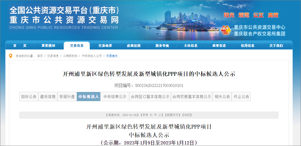 في 9 كانون الثاني / يناير 2023 ، وتشونغتشينغ الموارد العامة شبكة التداول صدر تشونغتشينغ كايتشو بولي منطقة جديدة خضراء جديدة للتنمية والتحول إلى نوع جديد من التحضر تعادل القوة الشرائية المشروع الفائز في الانتخابات العامة ، المشروع من قبل الصين يمكن أن يبنى اتحاد 7 وحدات ، مثل الفوز في الانتخابات ، ويقدر مجموع الاستثمار في المشروع 10.51 مليار يوان .