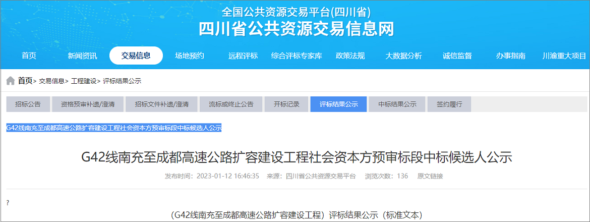 في 12 كانون الثاني (يناير) 2023 ، أصدرت شبكة تجارة الموارد العامة لمقاطعة سيتشوان الإعلان العام عن مقدمي العطاءات الناجحين لقسم العطاءات المسبقة الفحص لمشروع بناء توسعة الطريق السريع G42 Line Nanchong-Chengdu. يبلغ إجمالي الاستثمار لهذا المشروع 37.946 مليار يوان ، منها 7.5892 مليار يوان.