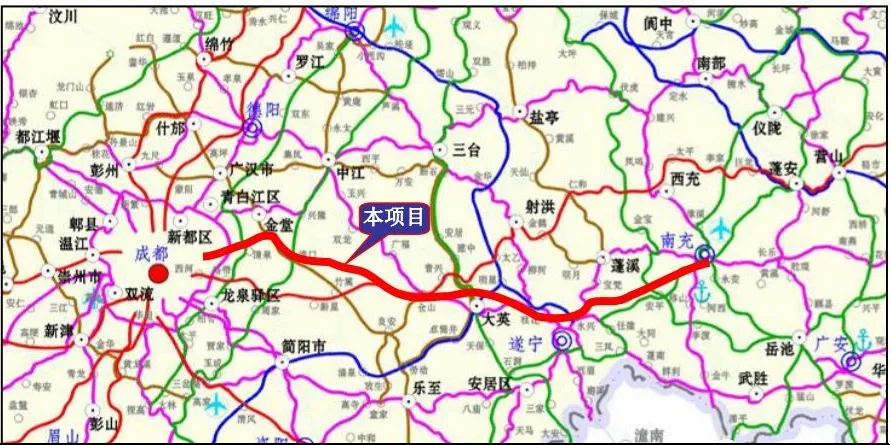 يبدأ مشروع بناء توسعة الطريق السريع G42 Line Nanchong-Chengdu في تقاطع Nanchong Dongguan ، ويمر عبر Hanjiawan و Gaoping و Jialing و Pengxi و Tangjia و Daying و Cangshan و Huaikou و Qingquan وينتهي عند ربط محور Chengdu Ring Expressway Luoshiba. يبلغ الطول الإجمالي لمسار المشروع 240.3 كيلومترًا ، منها 177.4 كيلومترًا تم توسيعها وإعادة بنائها من الطريق الأصلي ، و 62.9 كيلومترًا تم تشييدها حديثًا.