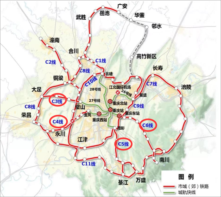 المدينة المركزية إلى خط Yongchuan (خط C4): من المنطقة الحضرية المركزية في Chongqing إلى منطقة Yongchuan عبر Bishan ، يبلغ الطول الإجمالي حوالي 70 كيلومترًا ، ويبلغ الاستثمار المباشر للمشروع حوالي 19.3 مليار يوان ؛