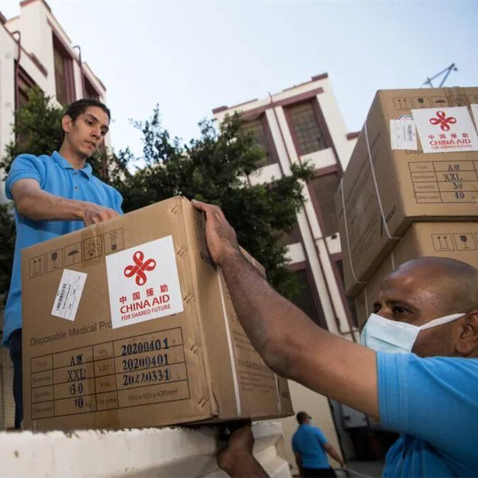 في 10 مايو 2020 ، في القاهرة ، عاصمة مصر ، حمل الموظفون مواد مضادة للوباء تبرعت بها الحكومة الصينية