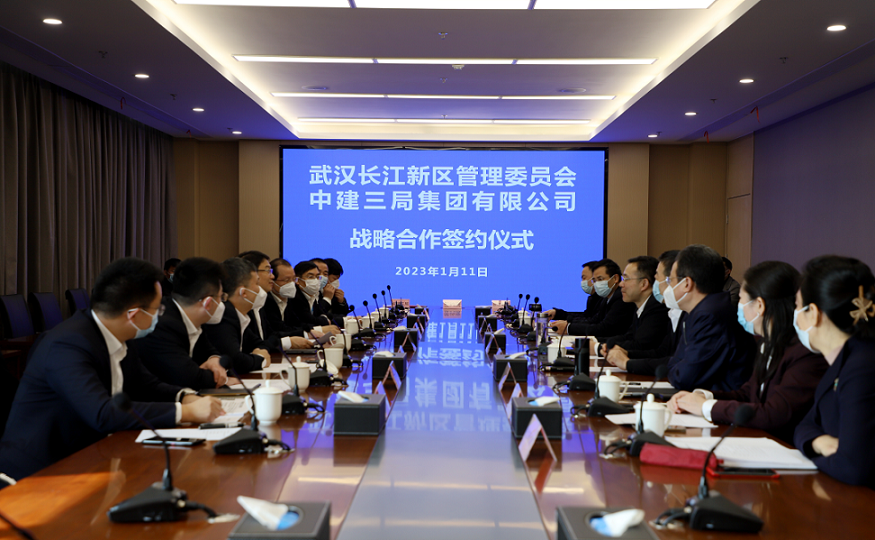2023年1月11日,中建三局与武汉长江新区管理委员会在汉签订战略合作协议。武汉市委常委、长江新区党工委书记张俊勇,中建三局党委书记、董事长陈卫国见证签约。