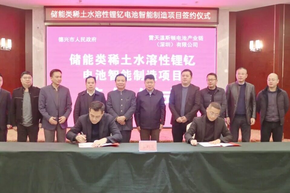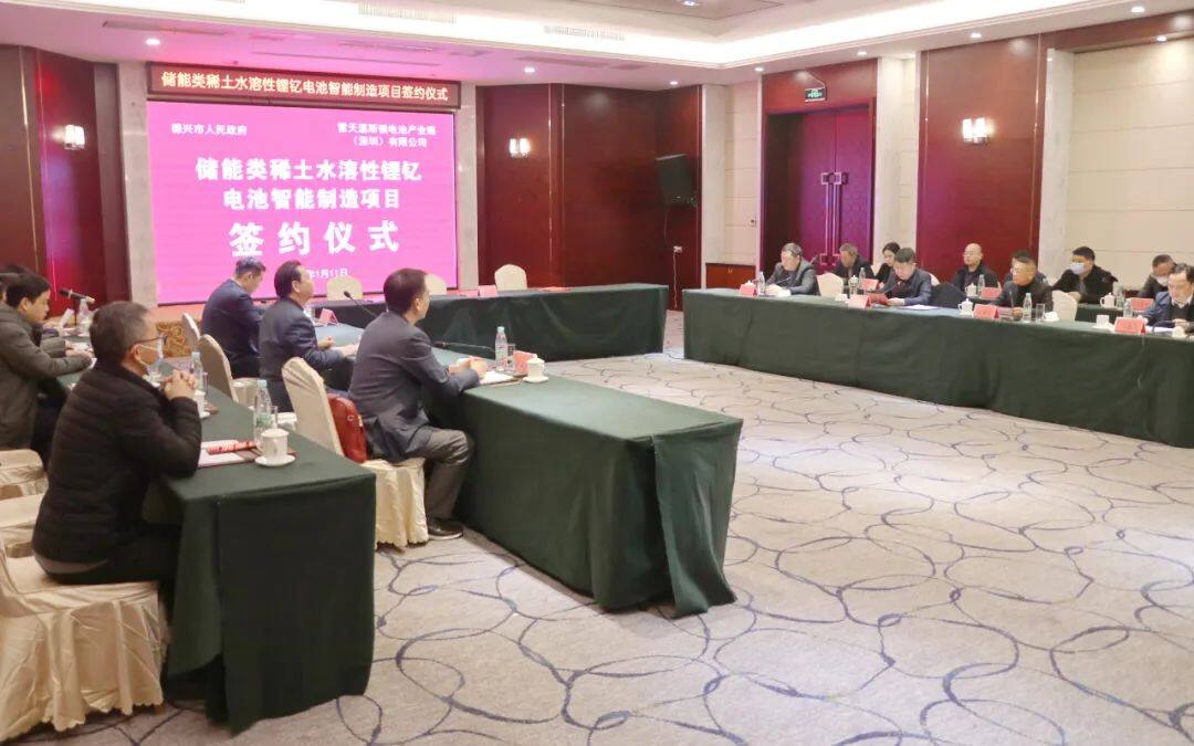 2023年1月11日,我市与雷天温斯顿电池产业链深圳有限公司在银鹿宾馆举行储能类稀土水溶性锂钇电池智能制造项目签约仪式。市委书记杨秀福,市委常委、统战部部长赵建颖,德兴高新区党工委书记洪宗露、管委会主任刘德波,雷天温斯顿电池产业链深圳有限公司首席科学家钟馨稼,公司董事长黄金山,公司总裁陈荣斌出席活动。活动由赵建颖主持。