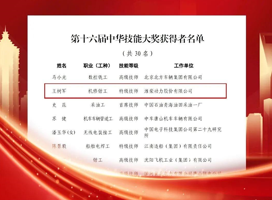 近日,国家人社部发布了《人力资源社会保障部关于表彰第十六届中华技能大奖和全国技术能手的决定》,潍柴工匠王树军获得“中华技能大奖”。本次全国共有30人获此殊荣,王树军是山东省唯一获表彰人员。
